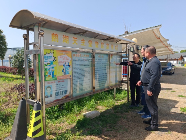 在厚桥天主堂,调研组一行首先查看了教堂的设施建设、消防安全及“四进”落实情况。厚桥天主堂主任司铎徐刚毅神父详细汇报了堂区在宗教中国化方面的创新举措,如在教堂装潢中融入传统中式建筑风格,在宗教活动中结合中华优秀传统文化开展宣讲。调研组重点考察了该堂区在“四进五爱”工作中的具体实践。鹅湖天主堂负责人向调研组介绍了堂区在政策法规学习、信众爱国主义教育及社会公益服务等方面的做法。近年来,鹅湖堂区积极组织信众参与《爱国主义教育法》学习,并通过举办爱国主题讲座、参观红色教育基地等方式,增强信众的爱国情怀。